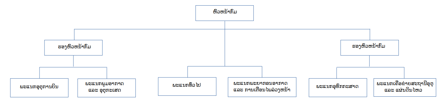 - ສະພາບອາກາດກ່ຽວກັບການບິນ. ພະແນກນີ້ເຮັດວຽກຮ່ວມກັບການຄວບຄຸມການຈະລາຈອນທາງອາກາດ “ການບໍລິການນຳທາງຂອງການບິນລາວ” (ກະຊວງໂຍທາທິການ ແລະ ການຂົນສົ່ງ).